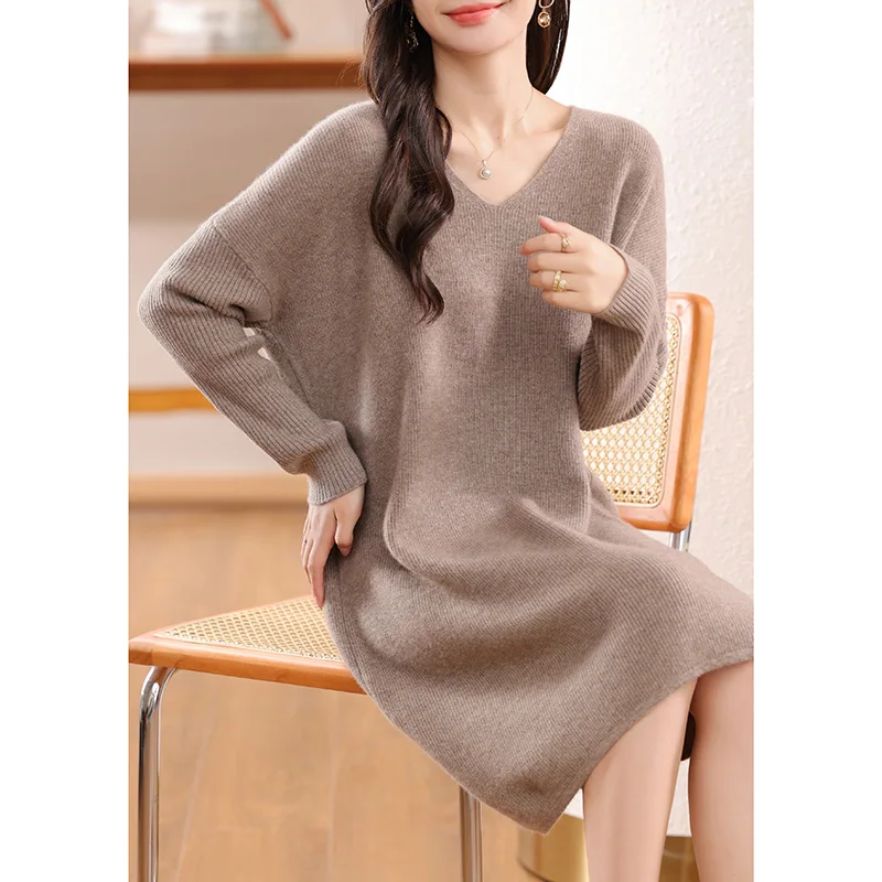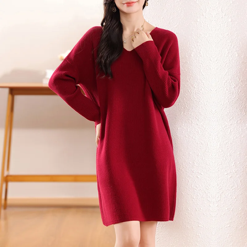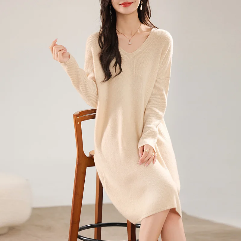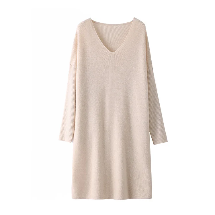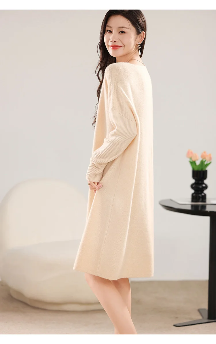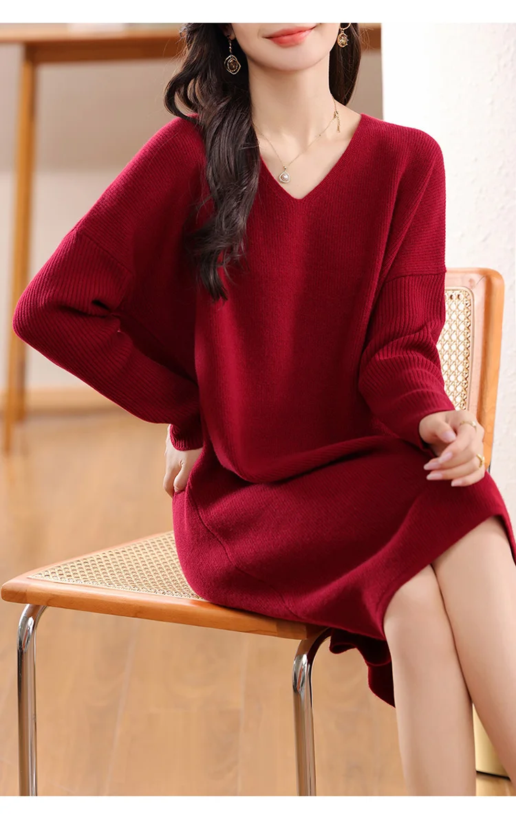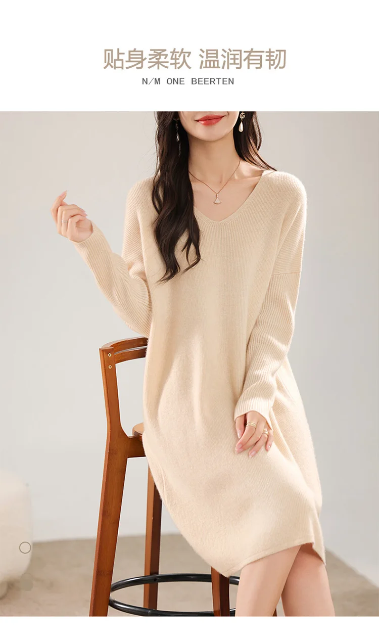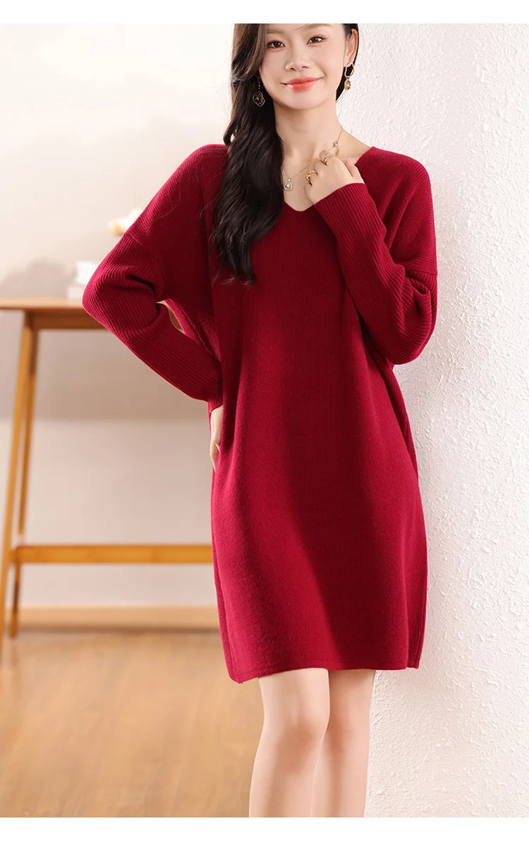 High-concerned chemical: None Craft of Weaving: Knit Material Composition: Natural Fiber Release Date: Autumn 2024 Closure Type: Pullover Profile Type: H Fabric Type: Knitting Type: regular Age: Middle Age Place Of Origin: China (mainland) Model Number: 130 Season: Autumn/Winter Neckline: V-Neck Waistline: Natural Sleeve Style: regular Dresses Length: Knee-Length Decoration: None Sleeve Length(cm): Full Pattern Type: Solid Silhouette: Straight Style: Office Lady Material: Wool Gender: Women Origin: Mainland China Brand Name: BARESKIY Elasticity: Medium Strecth Fit Type: Loose CN: Hebei